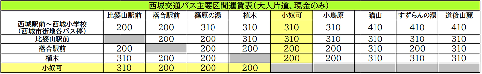西城交通バス時刻表(沿線主要停留所掲載)すべて平日のみ運行、土休日運休